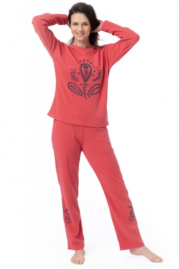 Pijama de dama realizata din tesatura plusata, extrem de moale si pufoasa. Pijamaua este compusa din 2 piese. Bluza are maneca lunga, decolteu in V, este usor alungita la spate si infrumusetata pe partea frontala cu imprimeu deosebit. Pantalonul este lung, are talie elastica confortabila, este prevazut cu buzunare la nivelul soldurilor si decorat in partile laterale ale gambelor cu imprimeu interesant.