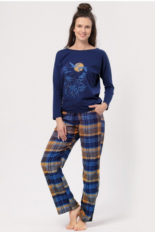 Pijama de dama realizata din tesatura de inalta calitate, compusa din 2 piese. Bluza are maneca lunga, decolteu semicircular si este infrumusetata pe partea frontala cu un imprimeu deosebit. Pantalonul este lung, confectionat din flanel pentru a va asigura o senzatie de caldura si confort, are talie elastica confortabila, prezinta model cu carouri si este prevazut cu buzunare laterale.