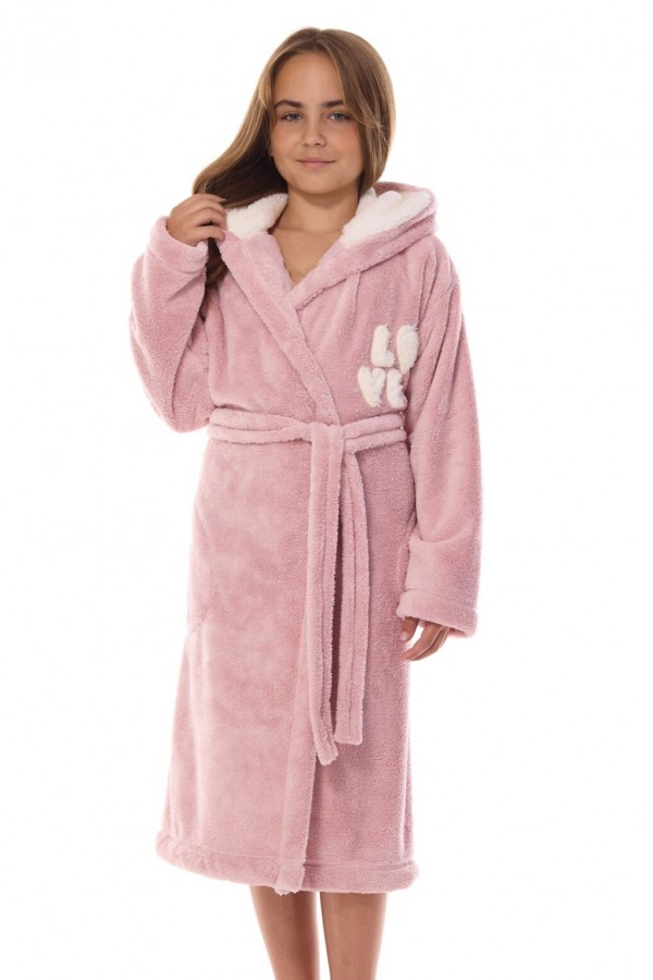 Halat de baie/casa pentru fetite realizat din tesatura moale, pufoasa si placuta la atingere. Halatul are maneca lunga, este prevazut cu buzunare laterale, cu gluga, se leaga in talie cu un cordon si este infrumusetat in zona pieptului cu inscriptia plusata "LOVE". Un halat de baie menit sa ii confere copilului tau un maxim de confort.