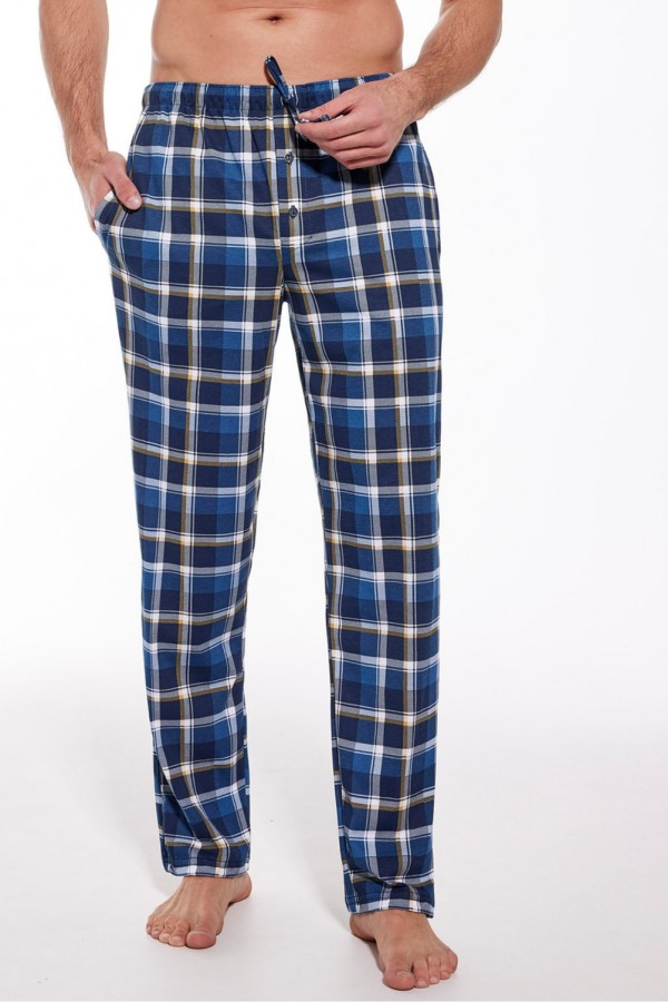 Pantalon de pijama pentru barbati realizat din bumbac de inalta calitate. Pantalonul este lung, are talie elastica confortabila, prezinta model deosebit cu carouri, este prevazut cu buzunare laterale, are slit ce se fixeaza cu ajutorul a doi nasturi si se ajusteaza in talie cu ajutorul unui snur.